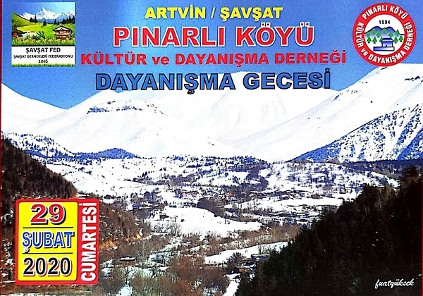 Şavşat Dernekleri Federasyonumuzun Kurucu üyesi olan Pınarlı Köyü Kültür ve Dayanışma Derneğinin 29 Şubat 2020 Cumartesi akşamı saat 19:00- 24:00 arası Bahçelievler -Mert Düğün Salonunuda Dostların sofrasında bir arada olmak için hep birlikte o akşam o salonda Pınarlı Derneğimizin yanında olacağız , Pınarlı Köylülerle ve hemşerilerimizle birlikte Barış ve Kardeşlik Türkülerini söyleyip, halaylar çekmek için sizleride aramızda görmekten mutlu olacağız.